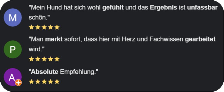 In meinem eigenen Salon kümmere ich mich mit Herz, Fachwissen und einer großen Portion Liebe um die Pflege Ihres Tieres. Vom eleganten Schnitt bis zur gründlichen Fellpflege – bei mir steht das Wohlbefinden Ihres Lieblings im Mittelpunkt.